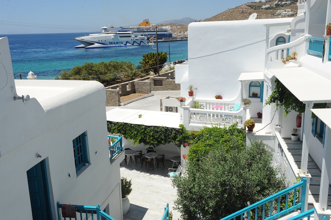 Το πρωί γευστείτε το πρωινό στην αυλή μας με θέα τη θάλασσα και το απόγευμα χαλαρώστε απολαμβάνοντας το διάσημο Μυκονιάτικο ηλιοβασίλεμα με καλό κρασί και νόστιμους τοπικούς μεζέδες (ειδικά επιλεγμένους από εμάς!).